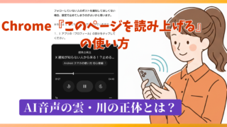 操作・設定 Chrome『このページを読み上げる』の使い方 AI音声の雲・川の正体とは? 「読みたい記事があるけれど、今はスマホの画面を見られない…」 そんな時に便利なのが、Google Chromeの標準機能「このページを読み上げる」です。これは、ニュースやブログなどのウェブサイトを、最新のAIがあなたの代わりに音読してくれる「耳で読む」ための機能。Android スマホのChromeブラウザからボタン一つですぐに使い始めることができます。 2026.02.04 操作・設定